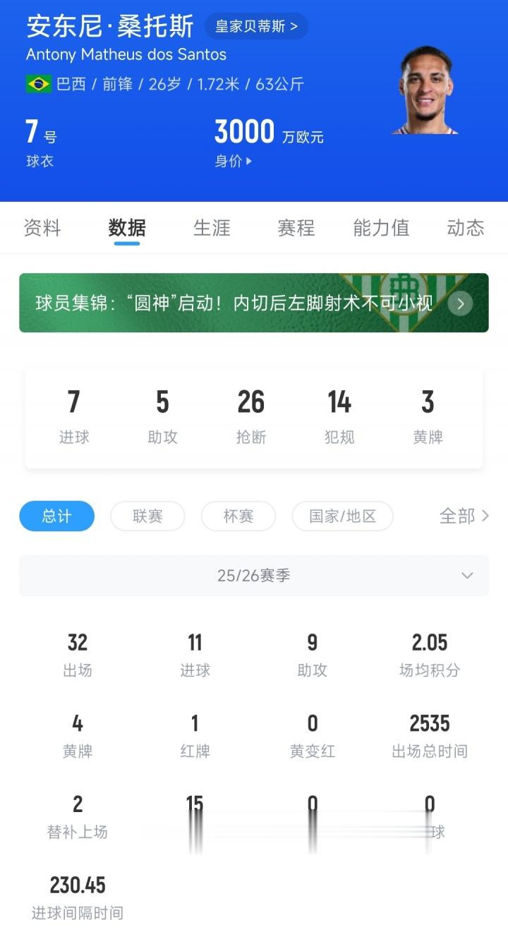 去年夏窗贝蒂斯花费2200万欧元的转会费,从曼联签下安东尼,本赛季安东尼代表贝蒂斯各赛事出战32场比赛,贡献11粒进球和9次助攻,他与球队的合同将在2030年到期。