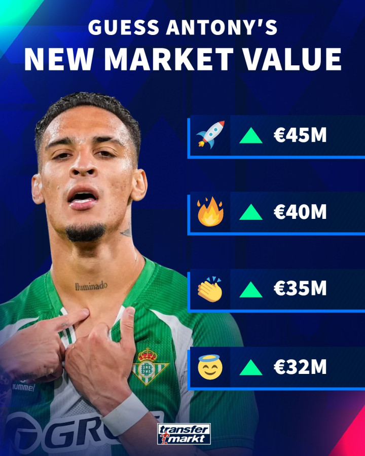 德转给出了安东尼身价变化的4个选项:3200万欧、3500万欧、4000万欧、4500万欧;目前安东尼的身价为3000万欧元,他也将确定迎来身价上涨。